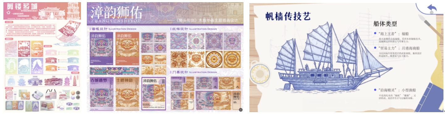 天财艺院学生组建创意团队,深入研读漳州五大文化名片的精神内涵与表现形式。学生们将调研所得转化为一件件兼具文化底蕴与创意亮点的设计作品。无论是融入土楼元素的文创用品,还是以海洋文化为主题的交互动态可视化视频,亦或是承载红色记忆的创意饰品,都精准契合了“非遗活化与生活美学”的赛事宗旨,最终凭借鲜明的主题表达与出色的设计质感,全部顺利跻身复评阶段,展现了津财艺术学子的专业素养与创新能力。